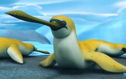 The gannetwhale is an aquatic flightless bird native to the North Atlantic coasts in 5 million AD. Gannetwhales are descended from diving gannets, but are significantly better adapted for life in the ocean, having become very large penguin-like birds reminiscent of seals and dolphins. However, unlike marine mammals, as birds, they are obliged to go ashore to roost, breed, and nest.